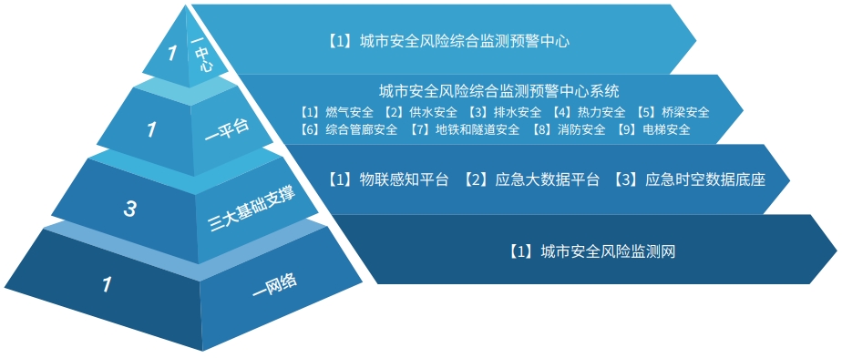 根据国家及应急管理部关于城市安全运行监测预警的要求,搭建城市安全空天地立体化的运行监测网,初步完成对市内三区燃气、供水、排水、热力、桥梁、综合管廊、地铁和隧道等城市生命线试点工程安全风险监测感知网络覆盖、监测预警系统建设,推进城市安全风险综合监测预警中心及平台建设,打造城市生命线安全风险监测预警专题应用系统,实现“能监测、会预警、快处置”三大能力,建立“智能监测、分级预警、四级联动、依职响应”的安全监测预警运行机制和“应急管理部门、行业主管部门、权属责任单位、现场处置单位”四级协调联动响应的监测预警工作机制。按照“一网、一中心、一平台、广应用”的要求,结合具体的建设需求,构建“一网、一中心、一平台、三大基础支撑”。“一网”即城市安全风险监测感知网;“一中心”即城市安全风险综合监测预警中心;“一平台”即城市安全风险综合监测预警平台;“三大基础支撑”包括物联感知平台、应急大数据中台和应急时空数据底座。