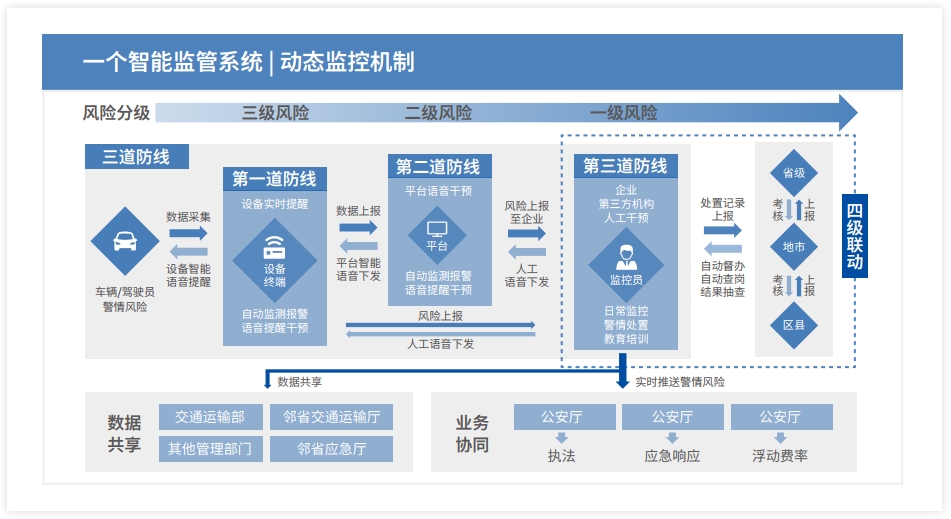 随着物联网、大数据等技术手段的普遍应用,为营运车辆和综合管理提供了新手段,只有以“防患于未然”的交通安全概念为指导,应用有效的安全监管机制和先进交通技术,实现事前、事中、事后三位一体的主动型动态监管方式,才能有效地遏制或减少道路事故,保证交通安全。