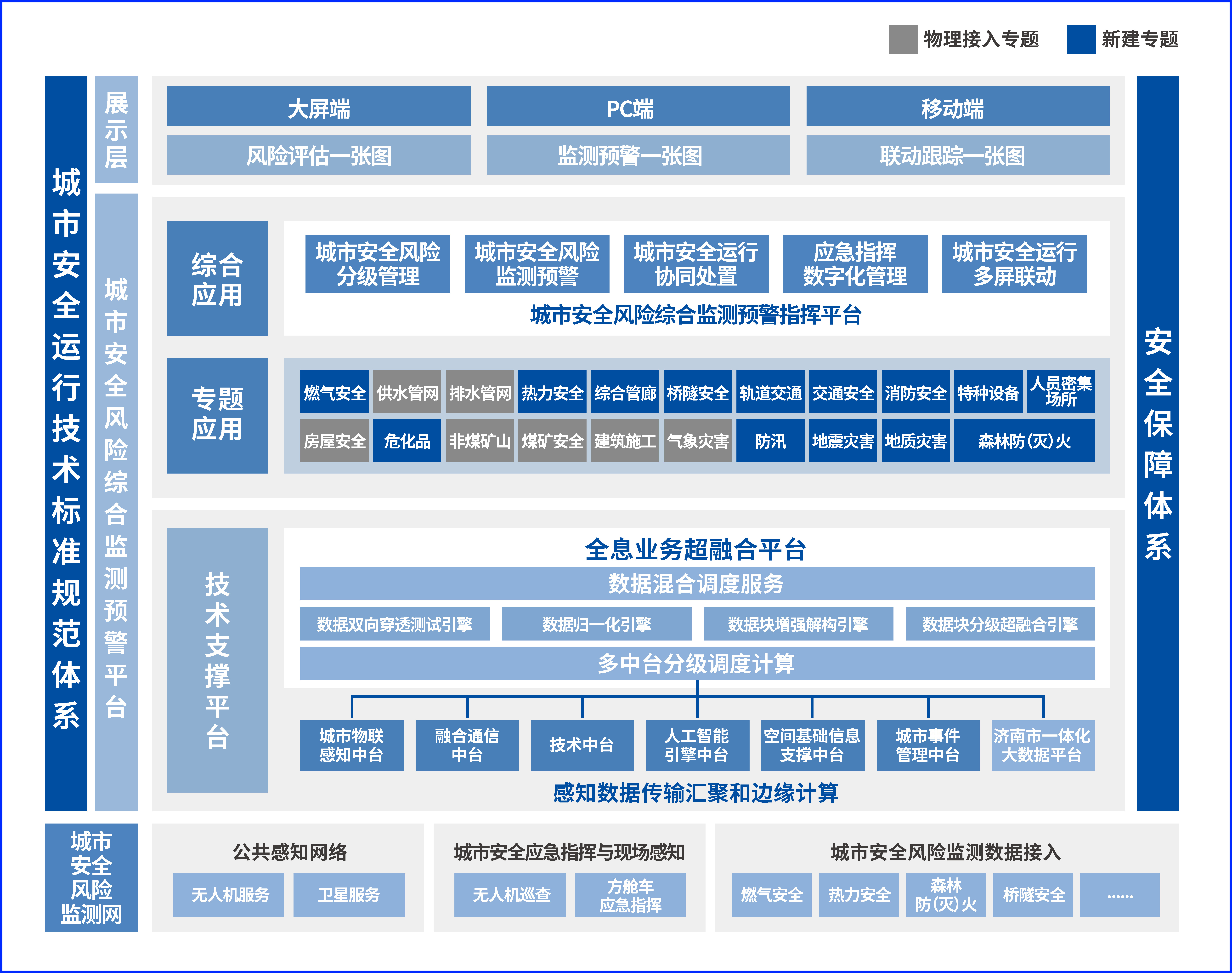 项目聚焦城市生命线、公共安全、生产安全、自然灾害等民生、安全领域,持续深化安全风险监测感知网络建设,搭建城市综合感知预警网络体系,推进数字技术与传统城市安全监测的融合,以数字化引领济南市城市安全发展。结合济南市城市安全运行现状,梳理城市安全21个专题感知网络,完善多源融合的城市安全风险监测感知网络,搭建城市安全运行监测预警指挥平台,实现城市安全运行“一平台”汇聚数据、“一规则”监测预警、“一流程”闭环处置、“一张图”指挥调度。建设局地强天气精密监测网、精准预报网、精细服务网和智慧数字气象台,建立起多维度、多方位、智能化的强天气监测体系,实现济南市局地强天气全面精密监测。