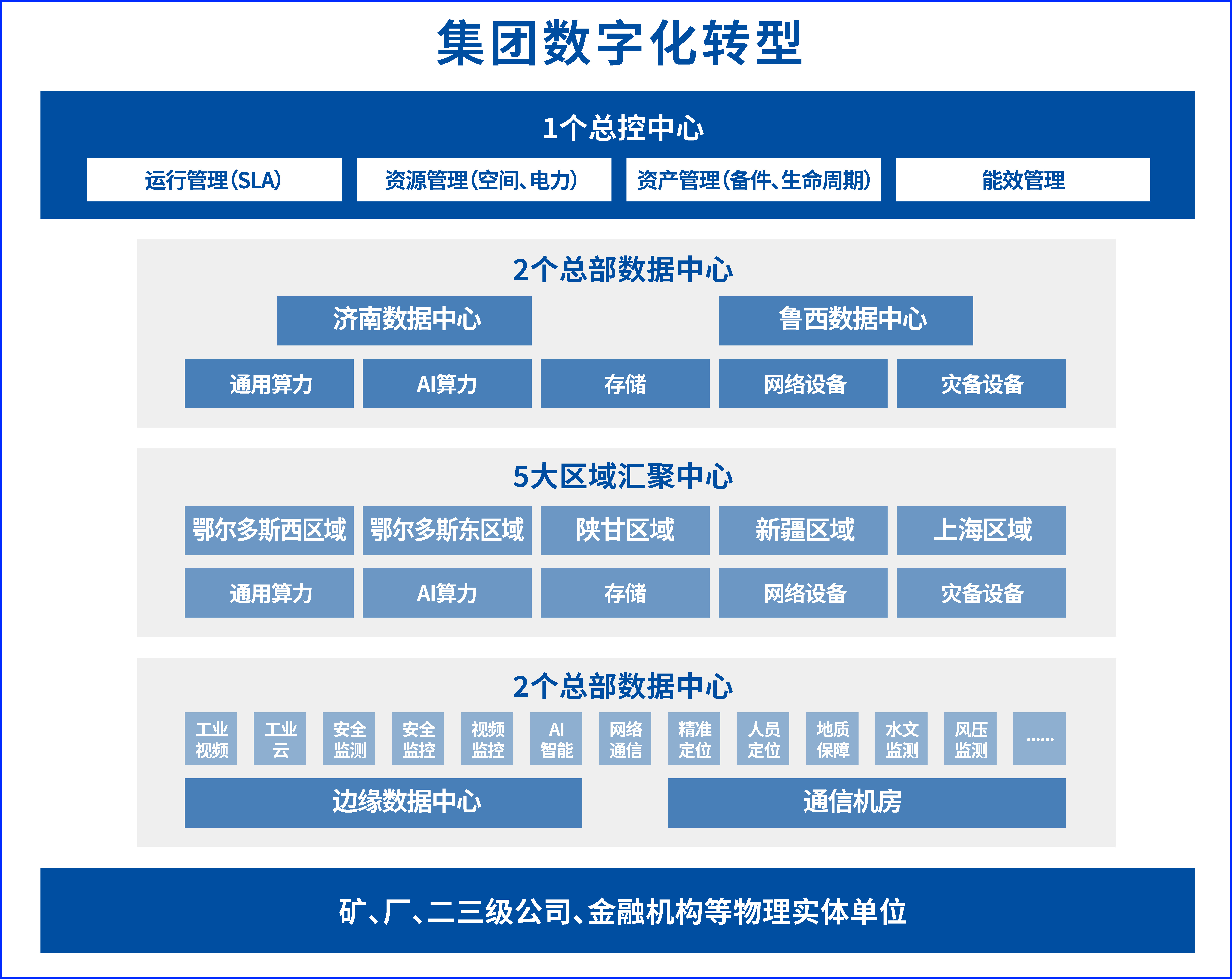 山东能源集团数据中心按照“1+2+5+N”总体布局建设。其中,“1”即山东能源集团“一朵云”,实现统一资源、统一平台、统一规范、统一管理、统一服务;“2”即在济南和济宁建设两个总部数据中心,形成互为主备的两地两中心架构,定位为集团业务的承载中心、AI训练中心、网络汇聚中心以及山东区域的算力中心;“5”即五个区域数据中心,拟分别在陕甘(西北矿业)、鄂尔多斯东(鄂尔多斯能化)、鄂尔多斯西(盛鲁电厂)、新疆(新疆能化)、上海(中垠虹桥V公馆)建设,定位为区域算力中心和网络汇聚中心,承载各区域统筹业务和区域内权属单位灾备业务;“N”即N个边缘数据中心(目前规划154个边缘数据中心,47个通信机房),作为边缘算力中心和AI推理中心,承载涉及安全生产的业务系统,由各厂矿单位根据边缘数据中心标准有序开展建设。