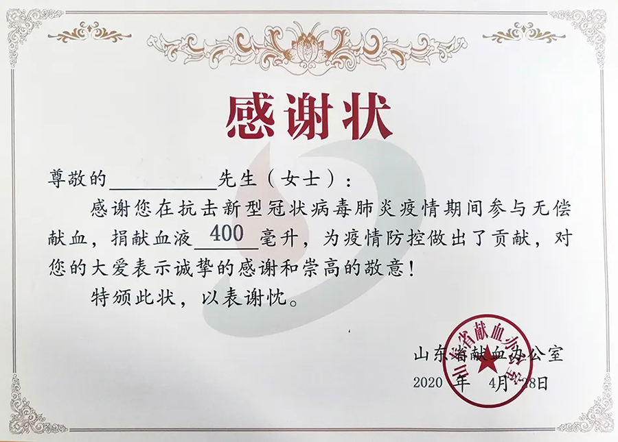必赢bwin线路检测中心认真贯彻落实集团工会、团委活动部署,坚持自愿原则,在员工中进行了广泛动员。4月28日上午,必赢bwin线路检测中心孙静、朱文强、黄士栋、宋茂春等一批优秀员工积极响应号召,赴山东省科学院进行无偿献血,他们每个人献血400毫升,用实际行动践行了无私奉献精神。尤其是销售经理孙静,尽管年龄已过40岁,但她巾帼不让须眉,在得知无偿献血的通知后,和其他三位男同事一样踊跃报名,而且在这次活动中同样献血400毫升。献血后,他们都收到了由山东省献血办公室颁发的《感谢状》,感谢他们在抗击新型冠状病毒肺炎疫情期间参与无偿献血,感谢他们为疫情防控做出的贡献,并对他们的大爱表示诚挚的感谢和崇高的敬意!