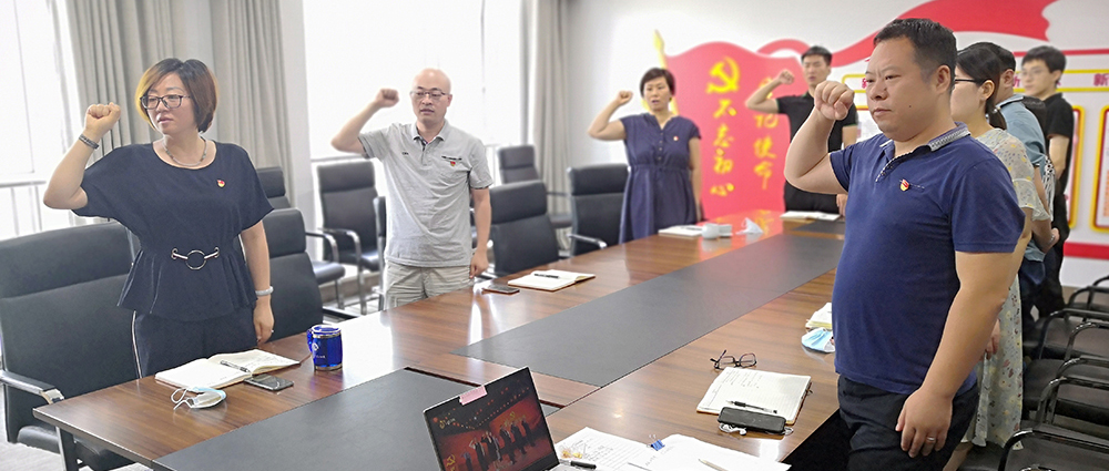 在《榜样讲党课》临近尾声之时,支部党员全体起立,向党旗致敬,一起重温入党誓词,誓言铮铮、掷地有声,每一名党员都要时刻铭记共产党人共同的信仰。
