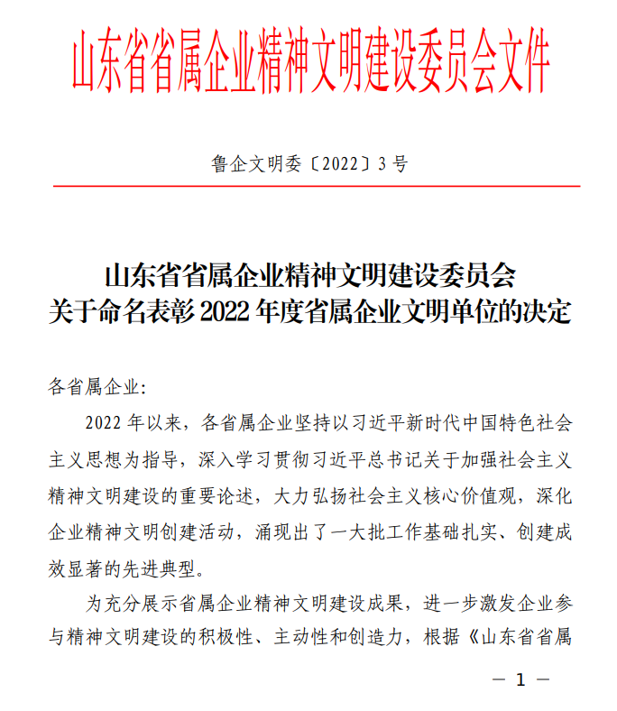 近日,山东省省属企业精神文明建设委员会发布文件,必赢bwin线路检测中心获评2022年度山东省省属企业文明单位。此次获评文明单位,是必赢bwin线路检测中心精神文明创建工作新的起点。
