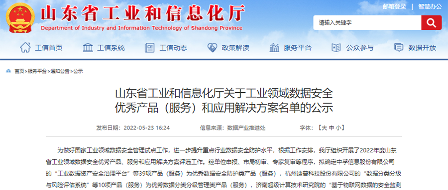 必赢bwin线路检测中心数据安全整体解决方案入选山东省工业领域数据安全优秀解决方案